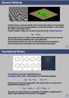 I received a fellowship from the International Max-Planck Research School to do my PhD at the best institution in the world for numerical relativity, the Max-Planck Institut für Gravitationsphysik (Albert Einstein Institute). They have super-computer clusters devoted exclusively to relativity, and a large scale collaborative "toolkit" for numerical simulation called Cactus, written in C++. With gravitational wave detectors at design sensitivity the need for numerical GW templates for signal recognition by detector pipelines is an urgent problem. With that in mind, and the fact that binary black hole inspirals and mergers are the strongest potential source for GW signals, my research focused on improving numerical simulations, and on the generation of GWs both for detector templates and for astrophysics.I formulated a set of boundary conditions for artificial boundaries for a first order in time and second order in space formulation of the Einstein equations. I showed that these conditions reduce noise, reduce constraint violation, and increase stability for 3D simulations. My boundary conditions are now used in numerical simulations both within and outside of the field of numerical relativity.